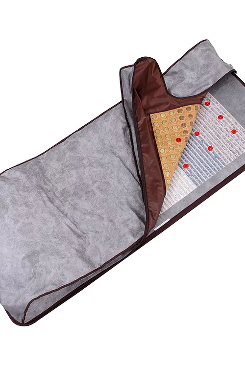 The top layer comprises of 116 x tourmaline stone discs and 162 x green jade stones with 12 x red photonic lights, negative ions and infrared heat. The top layer completely covers the body and connects to the bottom layer with a simple zipper fastening arrangement. This allows one to easily enter and leave the cocoon and aids in extra temperature control by venting one or both of the sides. The addition of tourmaline in this top layer promotes an abundance of negative ions due to the inherent natural properties of these stones as well as their natural magnetic field when heated or under mechanical pressure.